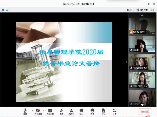 受疫情影响,根据学校要求,信息管理学院2020届本科毕业生论文(设计)答辩采用线上方式,4月29日、5月6日,我院顺利组织完成了2020届本科毕业论文(设计)第一轮答辩工作。计算机系和信息管理系使用腾讯会议,电子商务系使用钉钉。从中产生了3个校级本科优秀毕业论文(设计)推优候选论文,参加此次推优答辩会。