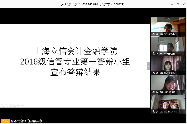 今年因受新冠疫情的影响,我校师生无法正常返校。信管系按照教育部相关工作部署,落实学校关于疫情防控期间教学工作的通知要求,组织2016级信管系本科学生进行线上毕业答辩。2020年4月22日,信管系召开全体教师会议,就线上答辩工作进行讨论和部署。4月26日~27日,各答辩小组分别进行了线上答辩彩排。4月29日下午,信管系通过腾讯会议线上平台,顺利完成了2016级信管系本科生线上毕业答辩工作,这是学院首次采用线上形式组织开展本科生答辩工作。