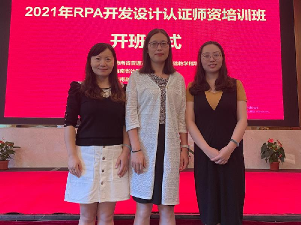为促进中国RPA人才的培养,提高高校教师人工智能教育教学改革与创新的业务水平和能力,进一步适应学校内涵式发展需要,2021年7月11日到16日,我校信息管理学院派出副院长胡翠华教授、电子商务系系主任刘岚副教授和电子商务系讲师常青青老师到海南博鳌参加“2021年海南RPA开发设计认证师资培训班”。