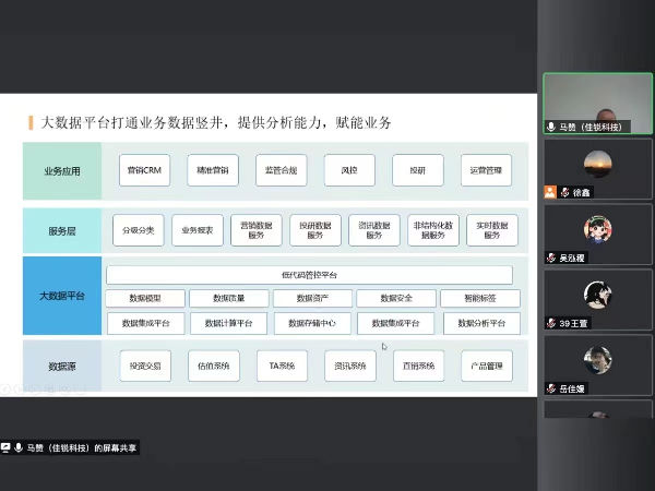 马总从金融行业数字化转型的痛点出发,讲述大数据底座平台赋能数据治理,以及大数据在资管领域精准营销、投研分析、监管合规方面的应用。通过财经数据资产、数据模型、数据应用的层次化方法,系统性、结构化的讲解资管行业大数据应用,取得良好的课程效果。