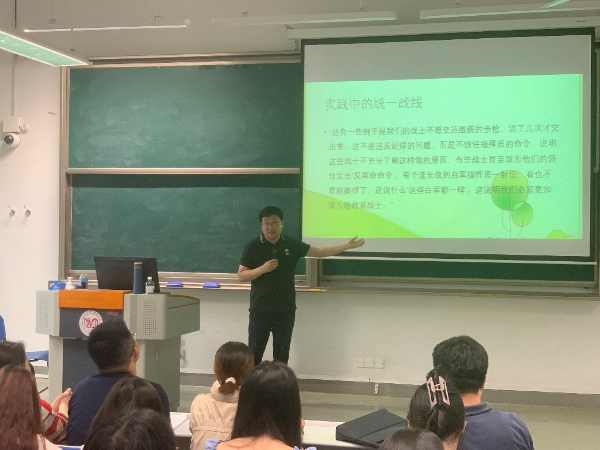 6月2日,“红星照耀中国——实践中的统一战线”学生统一战线专题学习教育活动在五教103教室举行,这是信息管理学院深入推进党史学习教育,加强基层党建,强化大学生理论学习的重要内容。本次活动由学院党员工作站、青马研究会联合主办,邀请马克思主义学院徐恺老师主讲,党总支副书记薛瑞峰老师主持,在校全体党员、各班理论学习代表80余人参加。