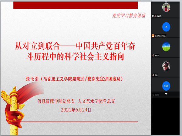 为进一步推动统战队伍线学好党史,加强理论武装,巩固政治共识,加强思想引导,做到学史明理、学史增信、学史崇德、学史力行,6月24日晚,信息管理学院党总支、人文艺术系党总支邀请马克思主义学院副院长、校党史宣讲团成员张士引做了主题为“从对立到联合——中国共产党百年奋斗历程中的科学社会主义指向”的线上党史学习教育讲座,信息管理学院及人文艺术学院领导班子、总支委员、各支部书记和民主党派教师、党外人士代表共同出席。