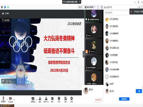 为大力弘扬北京冬奥精神,增强大学生勇于承担使命责任意识,信息管理学院党总支围绕2022“三全育人”工作实施方案,聚焦三圈育人重点,于4月20日下午由党总支书记张敏健以“大力弘扬冬奥精神,砥砺奋进不懈奋斗”为主题,为学院一百余名学生上了一堂线上思政课。
