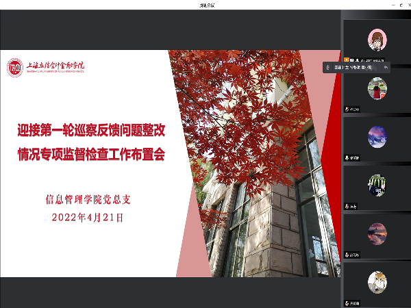 为贯彻落实学校关于第一轮巡察反馈问题整改情况进行专项监督检查的工作要求,确保学院巡察成果不折不扣得到落实,4月21日,信息管理学院党总支以线上会议形式召开了迎接第一轮巡察反馈问题整改情况专项监督检查工作布置会。党总支全体委员出席。党政办主任、专职组织员列席。会议由党总支书记张敏健主持。