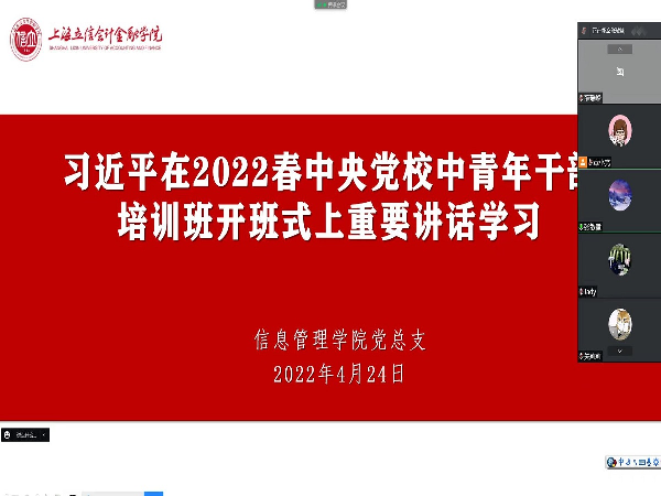 为突出政治建设这个党的根本性建设,把“第一议题”制度作为学习贯彻习近平新时代中国特色社会主义思想的重要抓手,固化“第一议题”学习制度,4月24日,信息管理学院党总支以腾讯会议形式召开了本月党总支学习(扩大)会议,学习主题为“习近平在2022春中央党校中青年干部培训班开班式上重要讲话”。党总支委员、学院80后青年干部出席会议。会议由党总支书记张敏健主持。