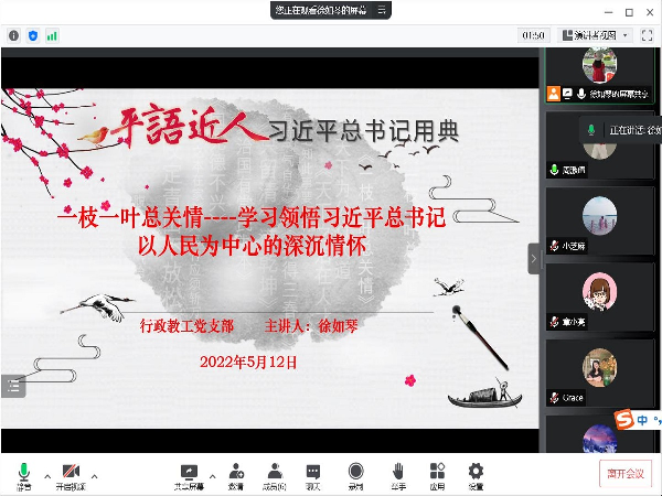 为履行好全面从严治党主体责任,加强基层党建工作,开展定期的党课学习,5月12日上午,信息管理学院行政教工党支部全体党员聆听了一堂主题为“一枝一叶总关情----学习领悟习近平总书记以人民为中心的深沉情怀”的党课。党课由信息管理学院行政教工党支部书记徐如琴主讲。