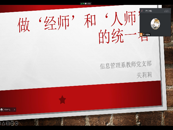 为履行好全面从严治党主体责任,加强思政课堂之意识形态工作,开展定期的党课学习,2022年5月28日,信息管理系支部书记关莉莉老师以“做‘经师’和‘人师’的统一者”为题,为支部名党员上了一堂意义深刻的党课。
