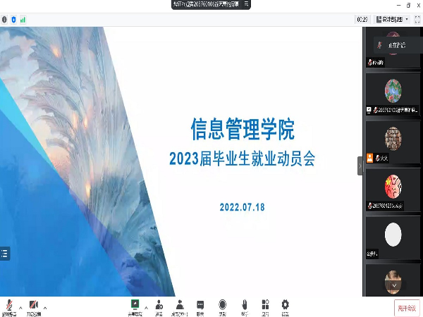 7月17日-18日,信息管理学院面向2023届毕业生开展两场线上就业动员会,这是学院强化毕业生就业思想教育,开展就业专项指导,深入推进就业工作的重要举措,党总支副书记薛瑞峰做动员报告并开展《简历与面试辅导》专题讲座,2023届毕业班辅导员及全体毕业生参会。