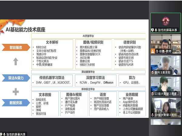 张恺先生首先介绍了公司概况、核心业务以及算法团队的主要功能,然后从AI与数字化、AI赋能金融、如何构建AI服务三个模块展开讲座内容。在AI与数字化方面,他从AI是什么的问题出发,深入讲述了机器学习、深度学习与AI的关系,揭示了AI火热发展背后的逻辑,并通过案例讲解视频图像分析、语音识别、红外测温、物流算法等AI技术的应用。在AI赋能金融方面,他从数据资源、算法算力、智能服务的AI基础能力技术底座出发,阐述AI在智能投研、智能信息服务、智能投顾、智能风控等领域的应用,提升了金融行业效率,降低金融门槛。并通过财经热点挖掘、市场舆情检测、舆情实体识别、智能投资助手、智能图片/视频巡检等案例剖析AI赋能金融领域创新。在如何构建AI服务方面,他认为AI服务的核心是系统性构建AI流程,包括数据准备、模型建立、模型评估、模型应用和评价。同时,他对人工智能与金融数字化的多模态技术产品化应用、AIGC内容生产以及元宇宙赋能金融等未来方向进行了展望,并为同学们推荐了一些人工智能相关的书籍。最后,他与同学们开展亲切互动,针对同学们提出的知识学习、学业规划、职业发展等方面问题进行了解答并给出了建设性的建议。