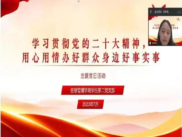为扎实推进学习贯彻习近平新时代中国特色社会主义思想主题教育,增强主题教育实效,切实发挥支部战斗堡垒和党员先锋模范作用,做到学思贯通,知行合一,2023年7月5日至7月25日,学生第二党支部组织全体党员按照暑期居住地实际需求分散开展“学习贯彻党的二十大精神,用心用情办好群众身边好事实事”主题党日活动。7月25日下午,支部召开党员大会对本月主题党日活动进行总结,支部教师,全体预备党员、发展对象、积极分子代表参加了会议。