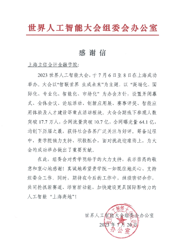 近日,智能金融研究中心收到一封世界人工智能大会组委会办公室发来的感谢信,对我校为大会的成功举办做出的贡献表示感谢。