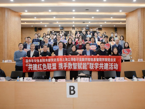 为深入学习贯彻习近平总书记考察上海重要讲话精神和中央金融工作会议精神,全面把握实践要求,以实际行动抓好贯彻落实,12月20日下午,信息管理学院党总支与国泰君安信息技术部党总支开展“共建红色联盟携手数智赋能”联学共建活动,会议在国泰君安后援中心A105会议室举行。信息管理学院党总支书记王铂、院长胡乃静、国泰君安证券信息技术部党总支书记、公司首席信息官俞枫,副书记、信息技术部总经理黄韦、党总支委员、信息技术条线综合事务负责人唐珏及双方教职工代表等60余人参加本次活动。