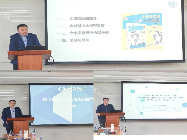 三位嘉宾围绕智能金融的核心议题展开主旨报告,为现场参会人员带来深度知识分享。复旦大学金融科技研究院副院长吕智慧、国泰海通证券金融科技研究室主管吴鑫涛、同济大学助理教授(上海领军人才)张铁华,分别结合自身研究与实践经验,围绕大模型发展、前沿技术应用及难点问题、图智能的发展与应用、产研融合落地路径等核心议题展开阐述,引发在场人员的广泛思考。