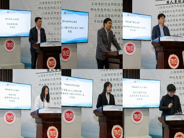 计算机与人工智能学院党委书记褚红素代表三家学院致答谢词,向关心关爱高校毕业生就业工作、设立企业奖学金、开展政产学研合作的用人单位表示感谢。上海商绘文化科技有限公司(盛商荟)、上海珪鑫商务咨询有限公司、上海颂凯实业有限公司、中证数智科技(深圳)有限公司作为企业代表就行业发展前景、岗位人才要求及求职方法进行了分享。