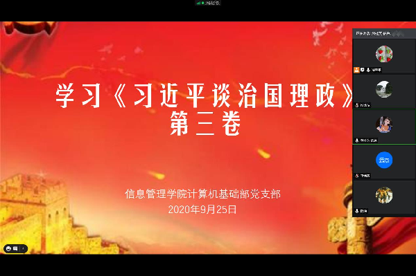9月25日,信息管理学院计算机基础部党支部全体党员围绕《习近平谈治国理政》第三卷进行集中学习研讨,深入学习领会党的十九大以来习近平总书记在领导推进新时代治国理政实践中发表的一系列重要论述。