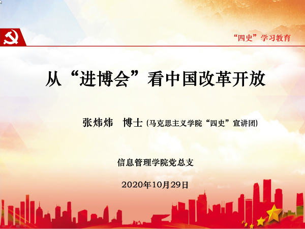 为进一步推动党员师生学好“四史”,充分利用学校丰富的思政理论课师资资源开展学习教育,10月29日,信息管理学院党总支邀请马克思主义学院“四史”宣讲团成员张炜炜博士做了主题为从“进博会”看中国改革开放的“四史”学习讲座。学院领导班子、总支委员、各支部书记和支委会成员、专职组织员、学生党员代表共同出席。
