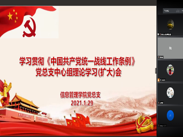为落实校党委指示要求,进一步巩固深化“不忘初心、牢记使命”主题教育成果,推动统一战线工作科学化、规范化、制度化,同时配合二期巡查共性问题整改工作,信息管理学院党总支于1月29日召开学习贯彻《中国共产党统一战线工作条例》理论学习中心组(扩大)会。党总支委员、班子成员、党政办主任、民主党派教师代表出席会议。会议由党总支书记张敏健主持。