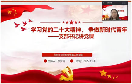 为深入学习贯彻党的二十大精神,进一步加强党支部学生理论教育,引领广大同学在新时代新征程中凝聚共识、踔厉奋发,以青春之力贡献于中国式现代化建设。2022年11月30日,信息管理学院学生第二党支部书记李梦瑶以“学习党的二十大精神,争做新时代青年”为题,为学生开展一次学习宣传党的二十大精神专题党课,支部全体党员、发展对象、入党积极分子参加学习。